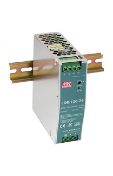 EDR-120-24 is a 120W 24V 5A Single Output Din Rail Power Supply with 90 - 264VAC input voltage.