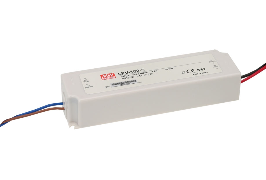 LPV-100-5 is a 60 Watt, 5 Volt, 12 Amp, single output LED lighting power supply with 90 - 264VAC input voltage.