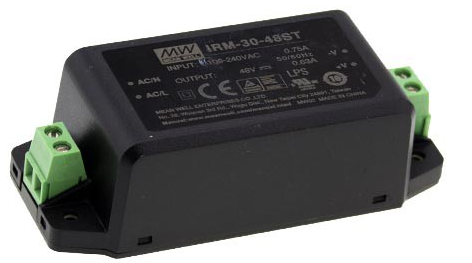 IRM-30-12ST is a 30W 12V 2.5A Single Output Encapsulated Power Supply with 85 ~ 264VAC input voltage. This miniature and compact screw terminal style power supply from Mean Well offers a low no load power consumption <0.1W, cooling by free air convection and protections including short circuit, overload and over voltage. The fully potted silicone improves heat dissipation and allows the unit to meet the anti-vibration demand up to 5G whilst providing dust and moisture resistance. IRM-30-12ST can be used in applications such as handheld electronic devices, factory automation equipment and industrial electrical equipment.